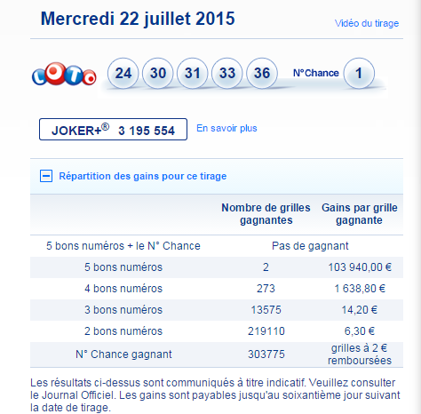 Tirage du mercredi 22 juillet 2015