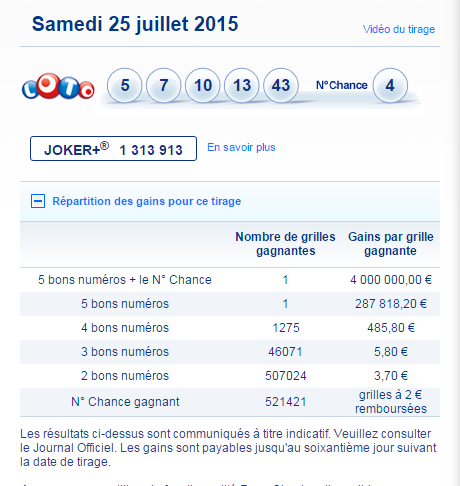 Seuls les résultats des tirages publiés au Journal Officiel font foi.