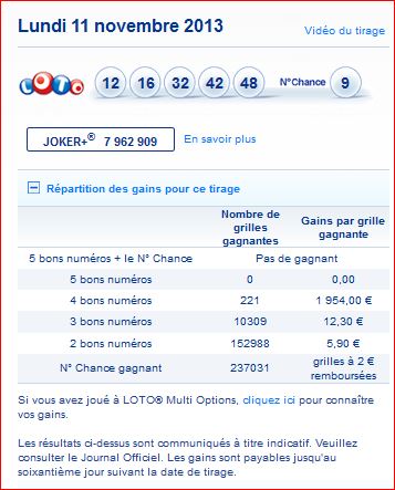 Tirage loto samedi 9 novembre 9/11/2013,numéros gagnants et tableau des gains (rapport)
