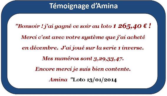 « Bonsoir ! j’ai gagné ce soir au loto 1 265,40 € ! Merci c’est avec votre système que j’ai acheté en décembre. J’ai joué sur la serie 1 inverse. mes numéros sont 3,29,33,47. Encore merci je suis bien contente.