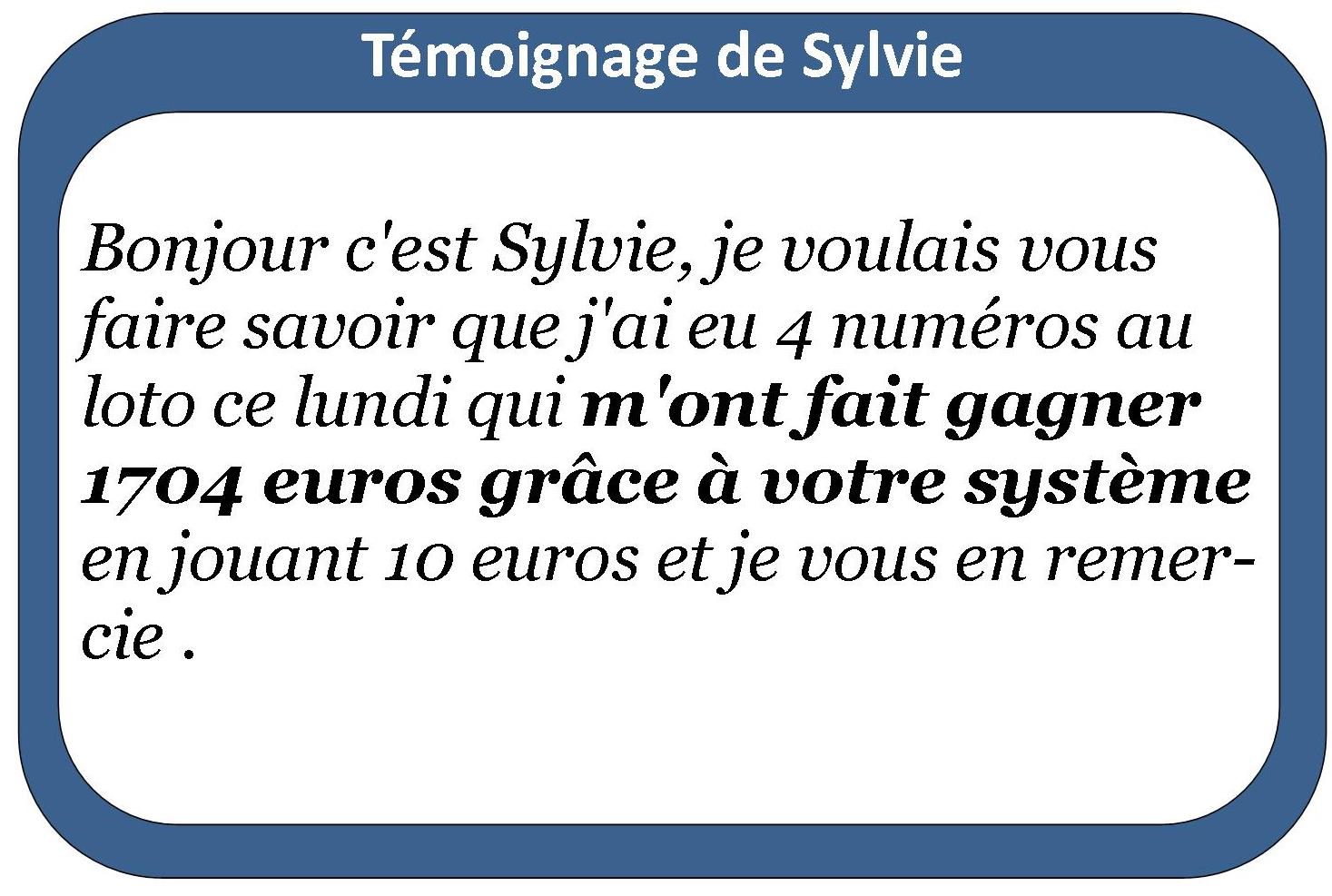 je voulais vous dire que j’ai eu 3 numéros au loto au tirage d’hier (8/05) j’espère que la prochaine fois sa sera la bonne merci a vous cordialement. Sylvie. « Le 10 juin soit juste un mois après son achat Sylvie à gagné à 4 numéros 1 704,00 € ! Bravo !