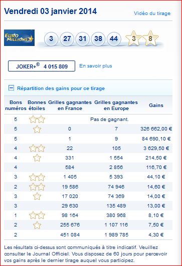 Rapport et répartition des gains de l’Euromillions du Vendredi 20 décembre 20/12/2013