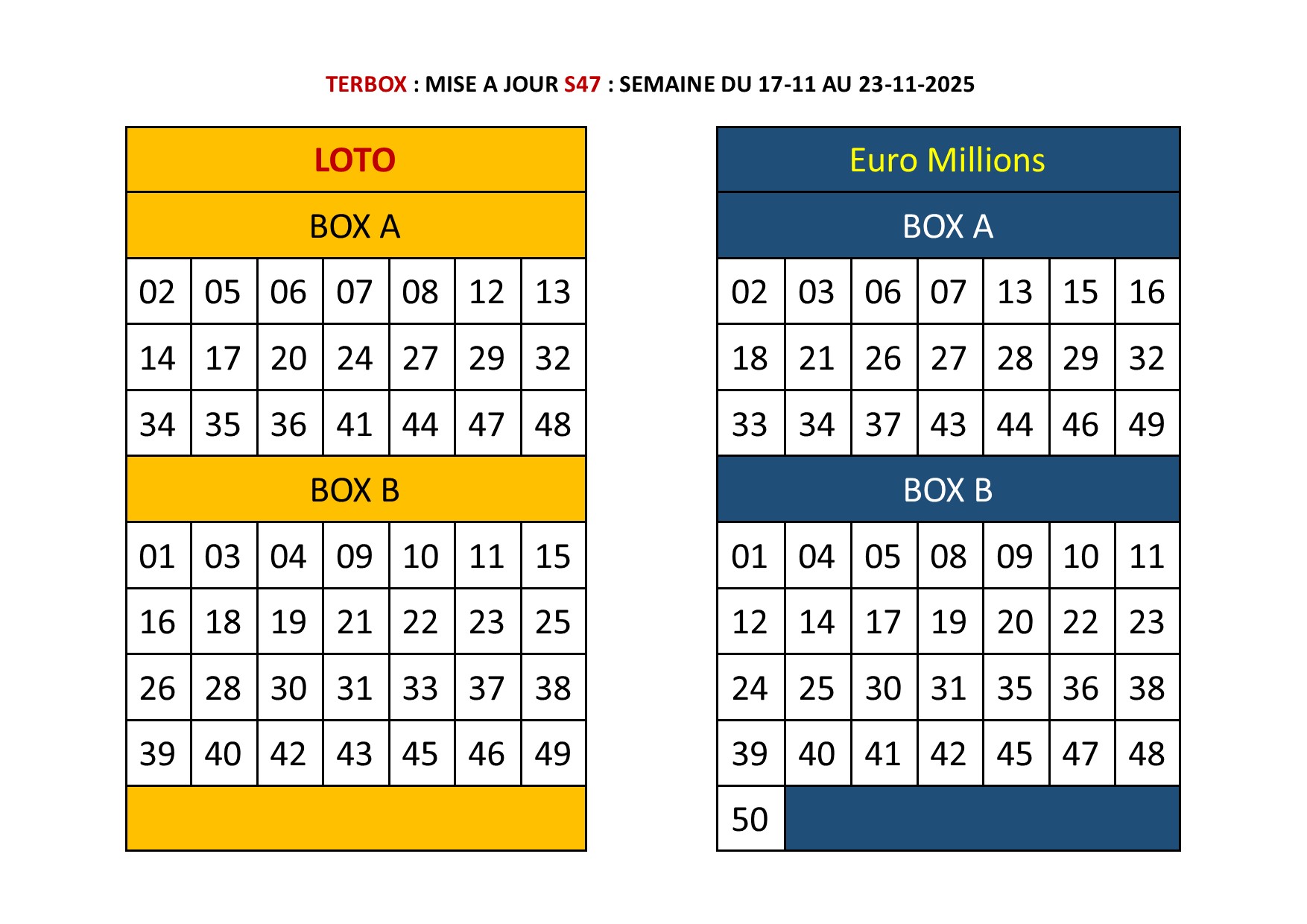TERBOX MISE A JOUR Publié le 26/10/2025 par admin Répondre MISE A JOUR SEMAINE 44 TELECHARGER LE PDF => CLIQUEZ ICI Découvrez les Stratégies de l’Intelligence Artificielle pour le Loto et l’EuroMillions Guide IA : Stratégies Gagnantes pour le Loto FOOT